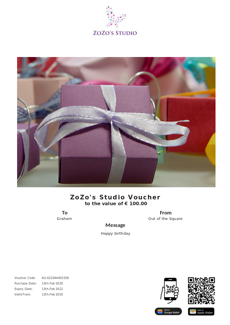 ZoZo's Studio allows you to purchase instantly printable gift vouchers, special offers and tickets using the Voucher Connect platform.